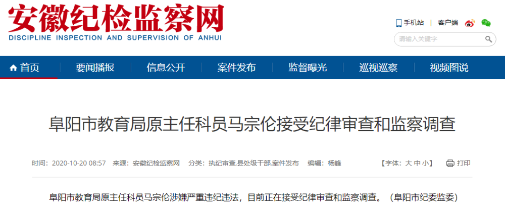 据安徽纪检监察网10月20日消息 阜阳市教育局原主任科员马宗伦涉嫌严重违纪违法,目前正在接受纪律审查和监察调查。